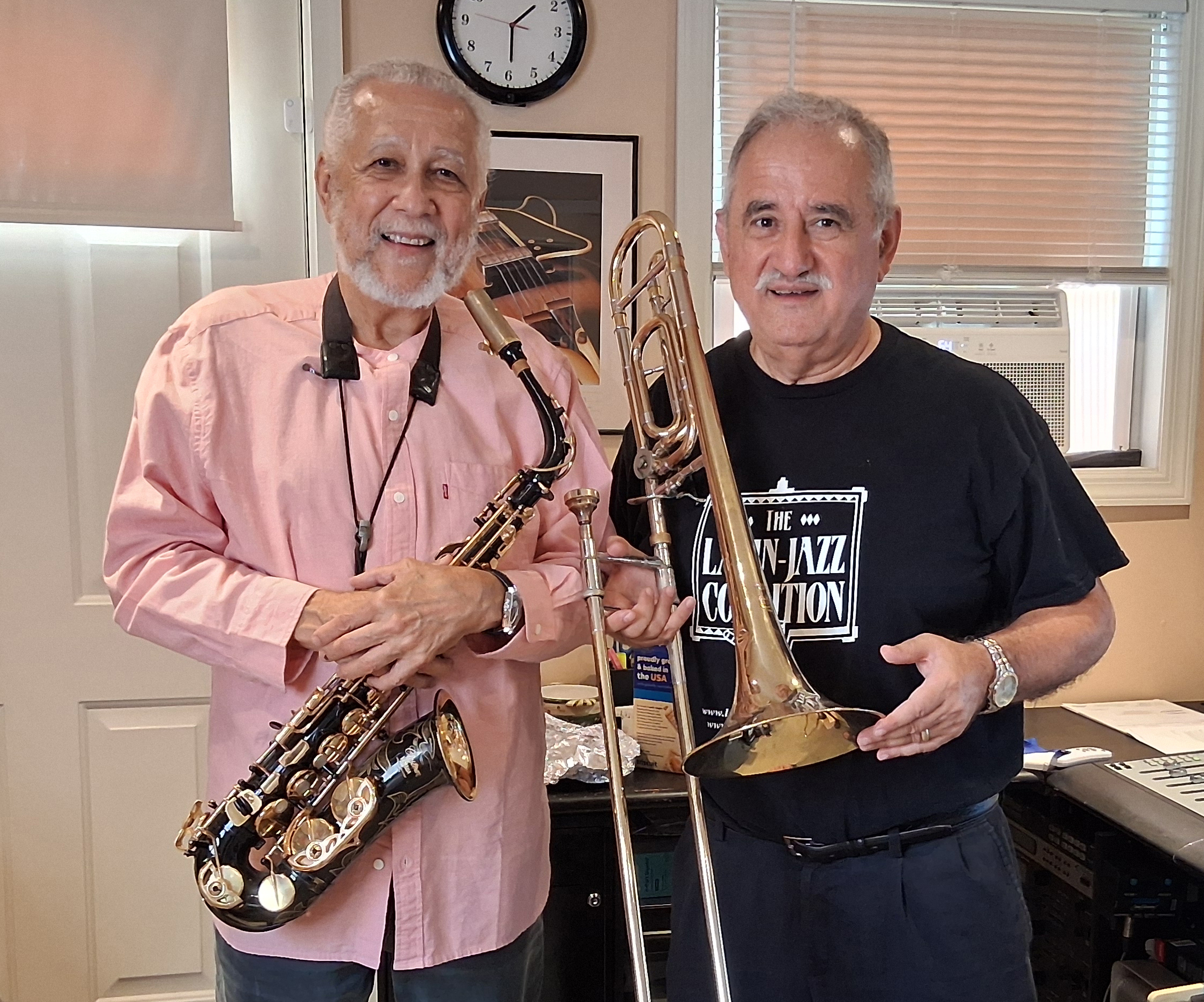 One of early presentations in the history of the Latin-Jazz Coalition, September 1987 in Sunnyside Queens, New York, Demetrios Kastaris on tenor and bass trombone, Frank Basile on tenor sax (photo credit Donald Wittekind)