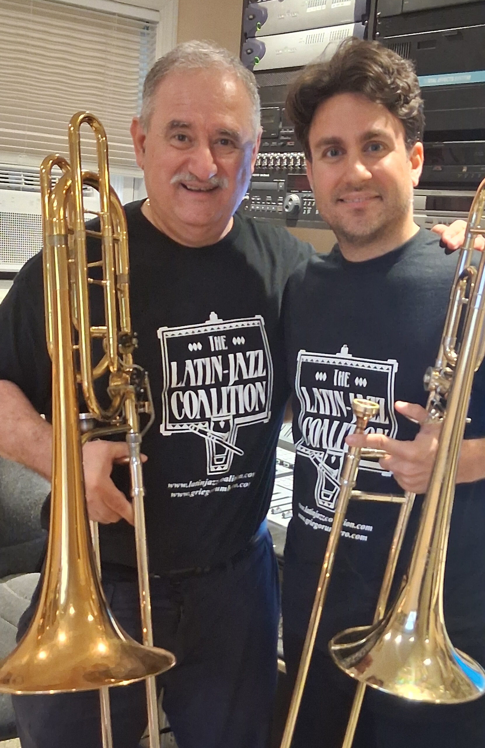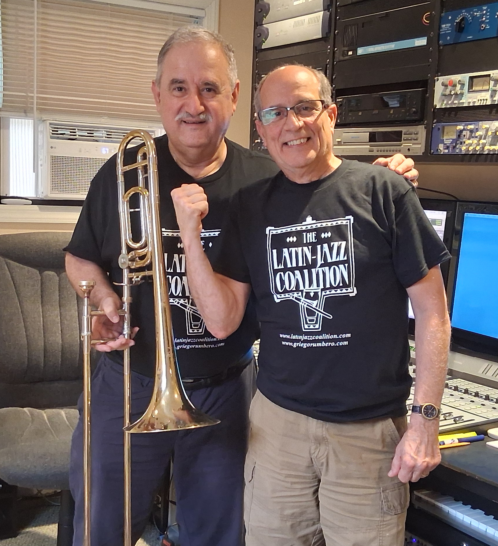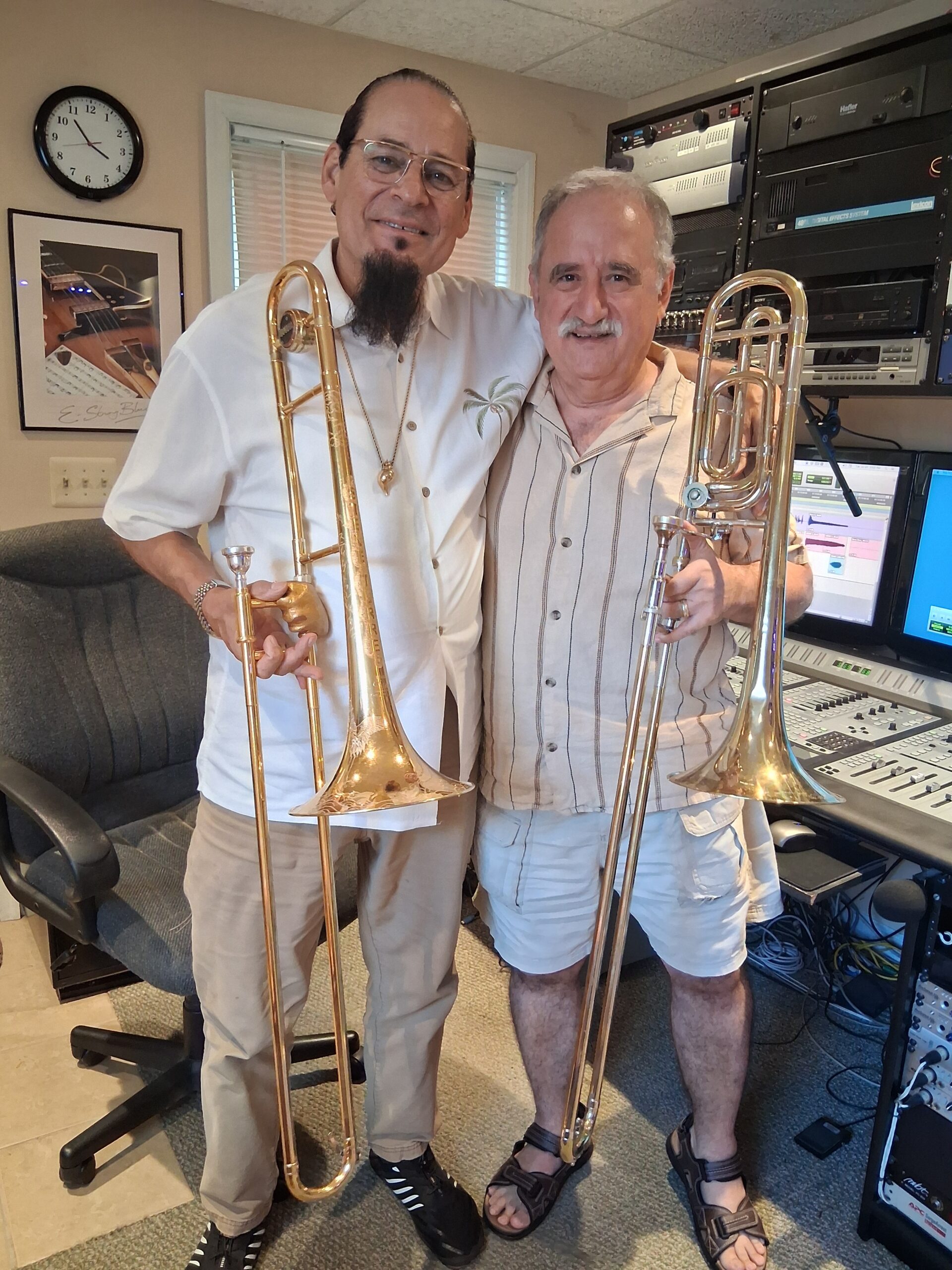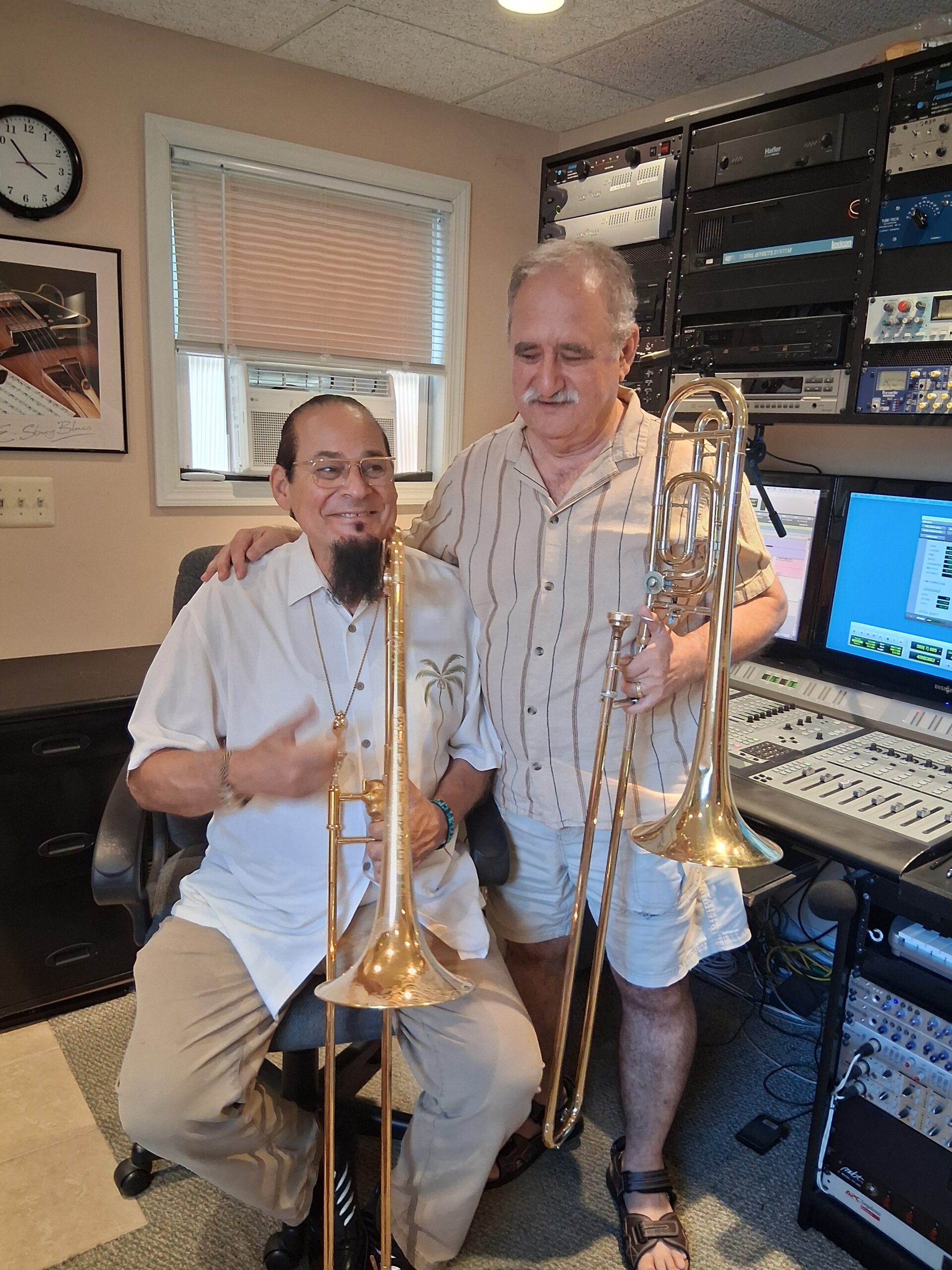Claudio Roditi, Demetrios Kastaris recording at Skylight Studio, Bellville, New Jersey, July 1999 (photo credit Hilda Kastaris)