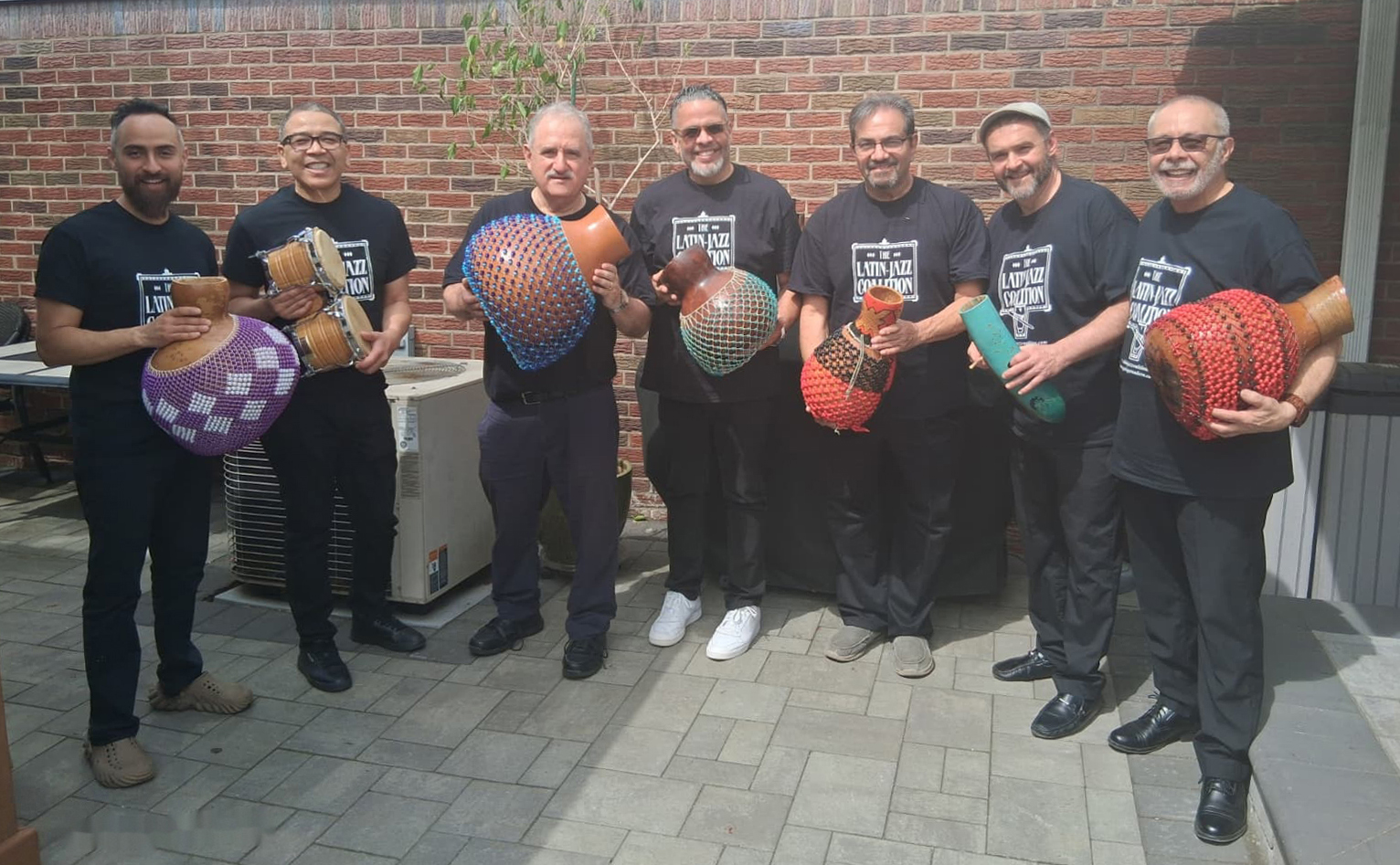 After the show, Edy Martinez, John Walsh, Alfredo de la Fé, Connie Grossman, Demetrios Kastaris, Dave Valentin, Wayne Goodman, Anthony Almonte Leon, Frank Almonte Leon, Angel Rodriguez, Wesley Reynoso, Solo Rodriguez, Hiram Remón, Andrea Brachfeld, Alí Bello, Memo Acevedo, June 16, 2003, Homenaje a Mongo Santamaría Concert, Seuffert Bandshell, Woodhaven Queens, New York, Photo credit: Jerry Lacay.