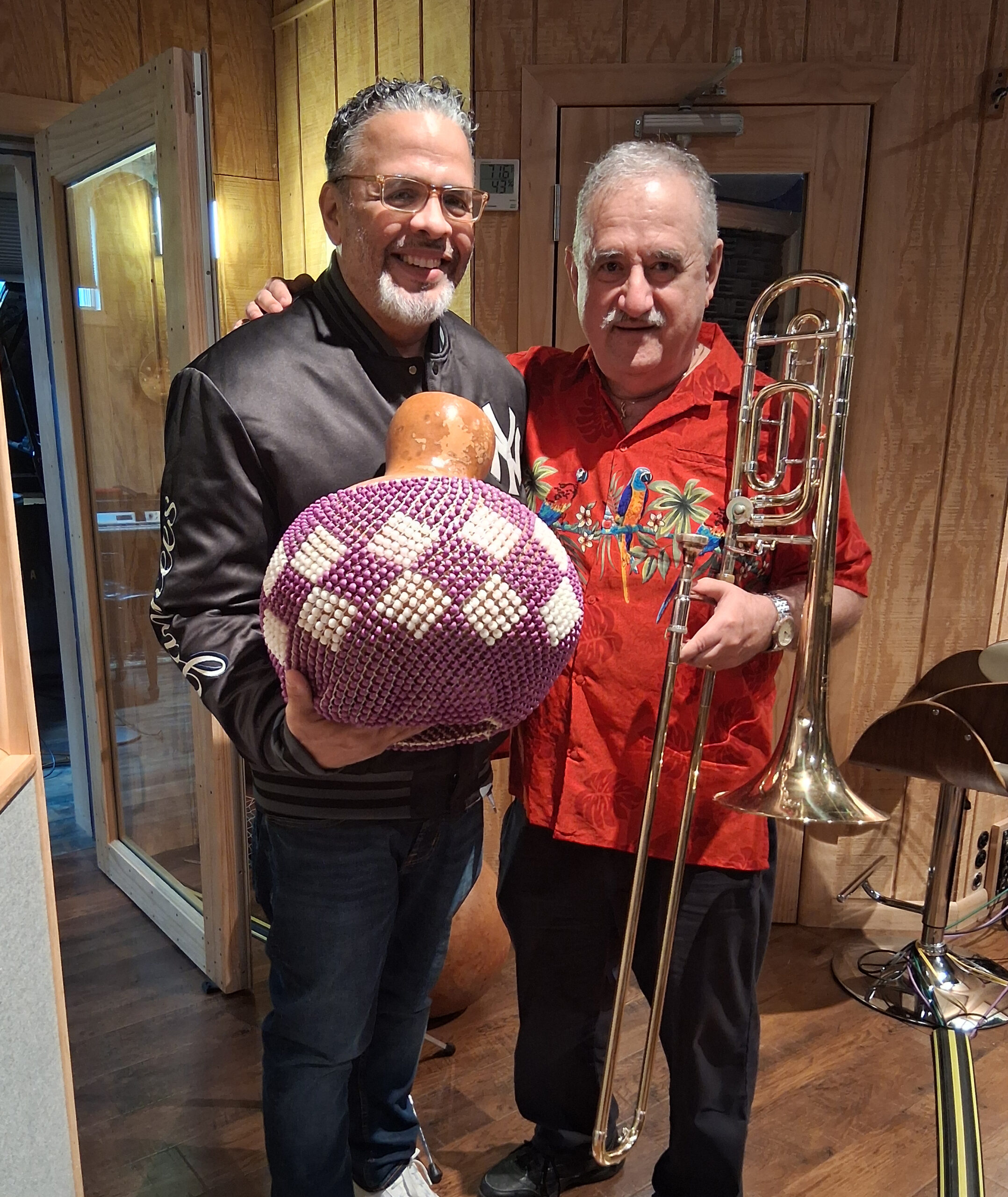Demetrios and Jazz icon trombonist Steve Turre discussing the music before the concert, Queens Theatre in the Park, Flushing New York, December 17, 2004, photo credit Jerry Lacay.