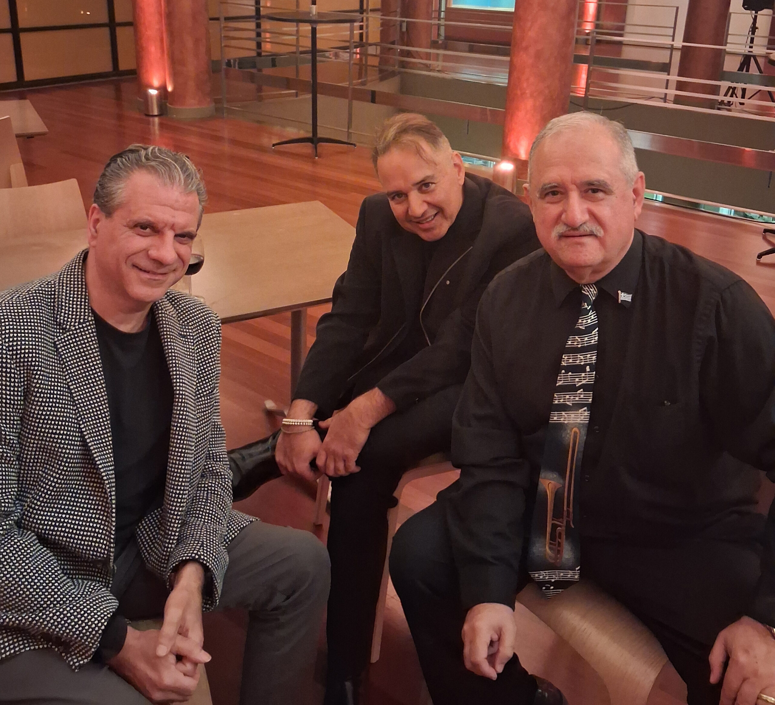 Backstage at the Village Gate in NYC, Demetrios Kastaris, Tito Puente, Paquito D' Rivera, February 27, 1990 (photo credit Hilda Kastaris)