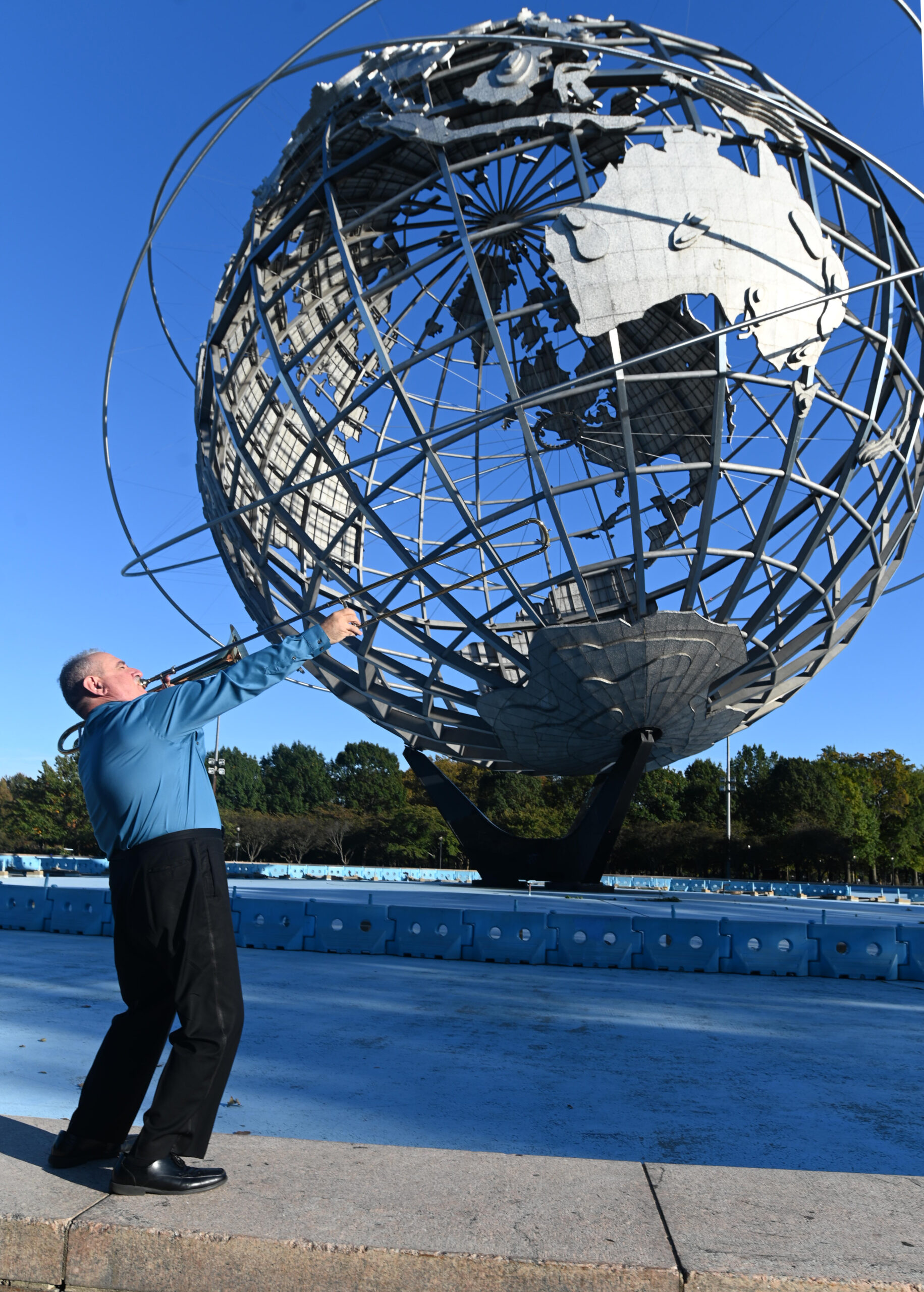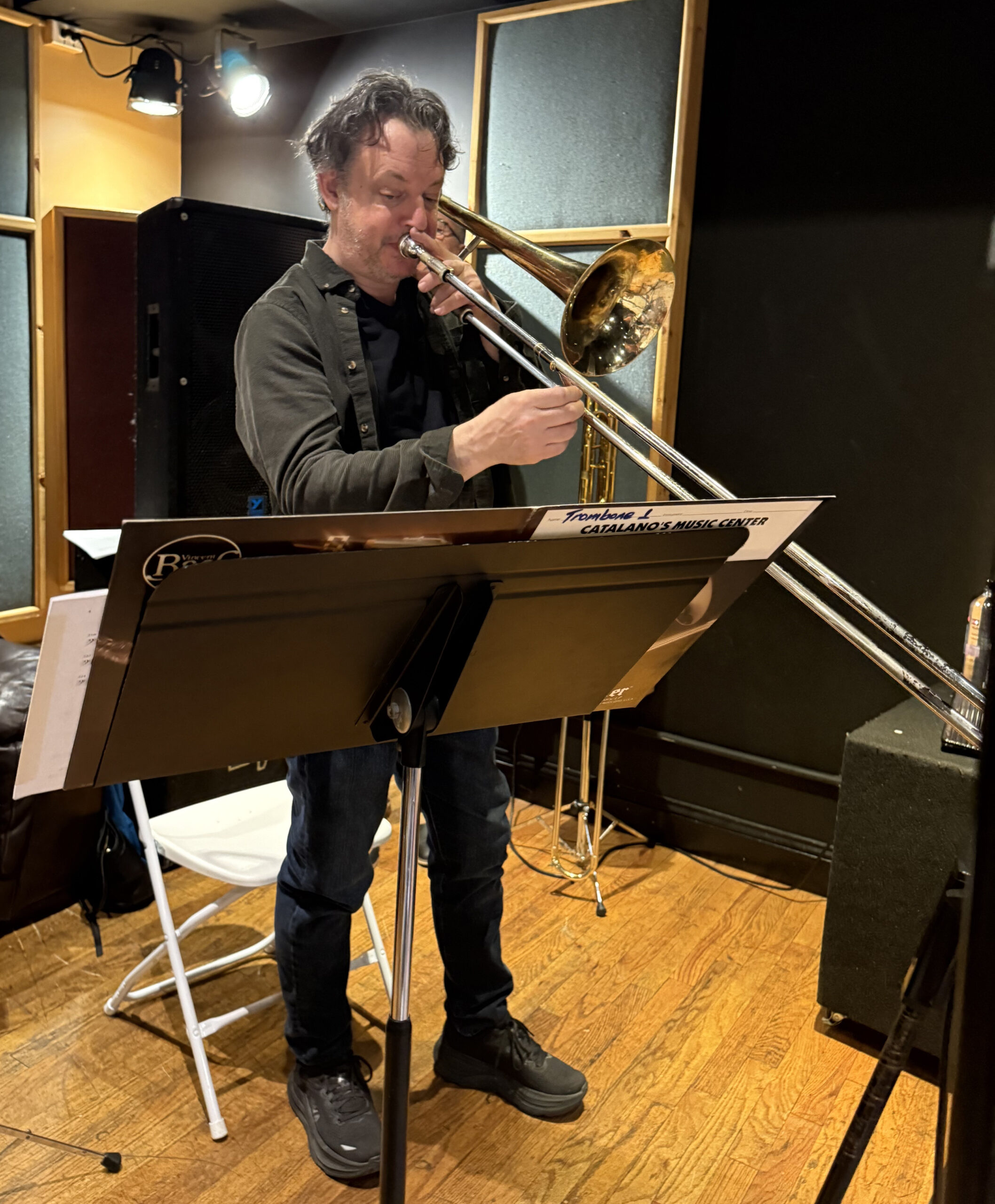 Demetrios Kastaris taking a solo on his trombone, Queens Theatre in the Park, Flushing New York, December 17, 2004, photo credit Jerry Lacay.